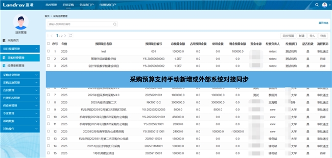 蓝凌智能招采管理实现了采购经费全流程管控。支持手动新增预算项目或与外部系统对接同步预算数据,避免账实不符。并支持预算实时监控,动态展示每个预算项目的关键信息。包含审核管理功能,采购预算需经多级审批,流程全程线上留痕,强化预算管控。