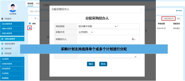任务分配:采购计划审批通过后,自动分配给采购经办人,经办人可根据项目类型选择采购方式,支持单个或多个计划批量分配;